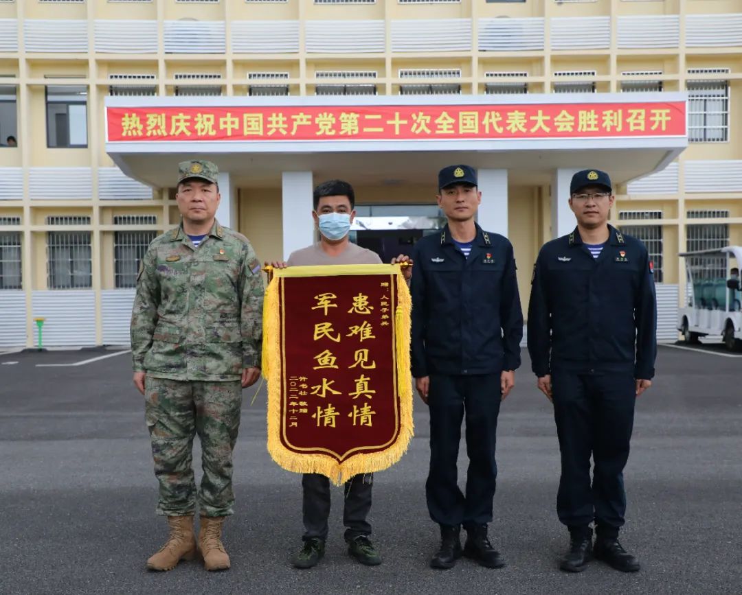 12月20日,海南籍渔民许书壮的表弟林国良将一面印有“军民鱼水情 患难见真情”的锦旗,送到南部战区海军某勤务船大队,代表表哥对海军官兵危难之时伸援手、转运千里救治的情谊表达真挚感谢。