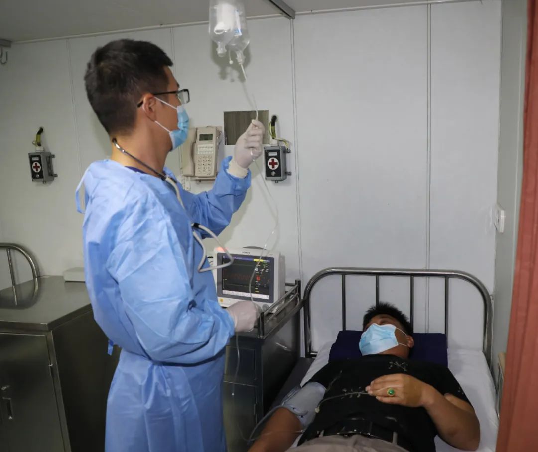从千里三沙到海南某港,漫长航渡途中,张炳良全时守护病员,定时输液治疗检查身体状况。