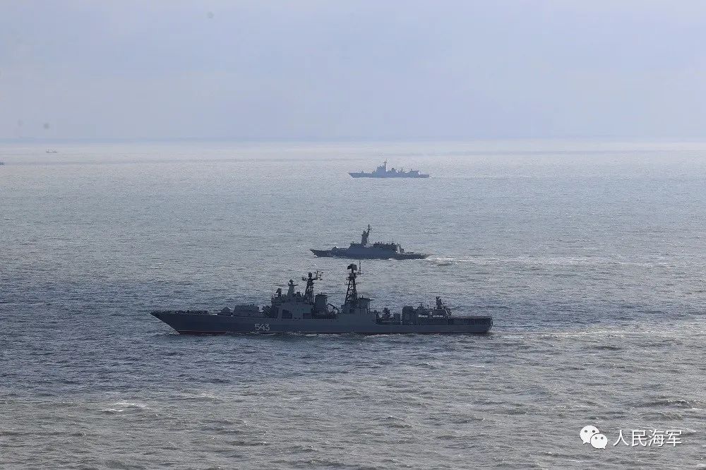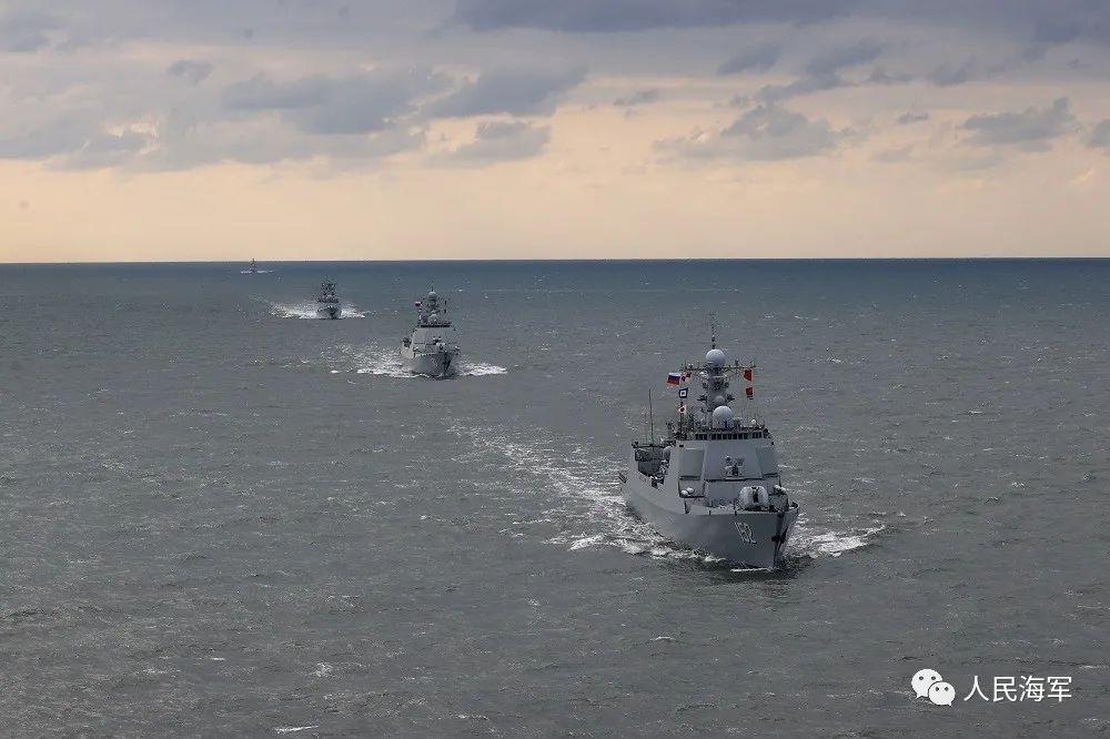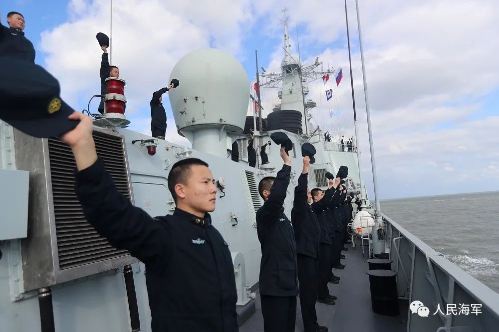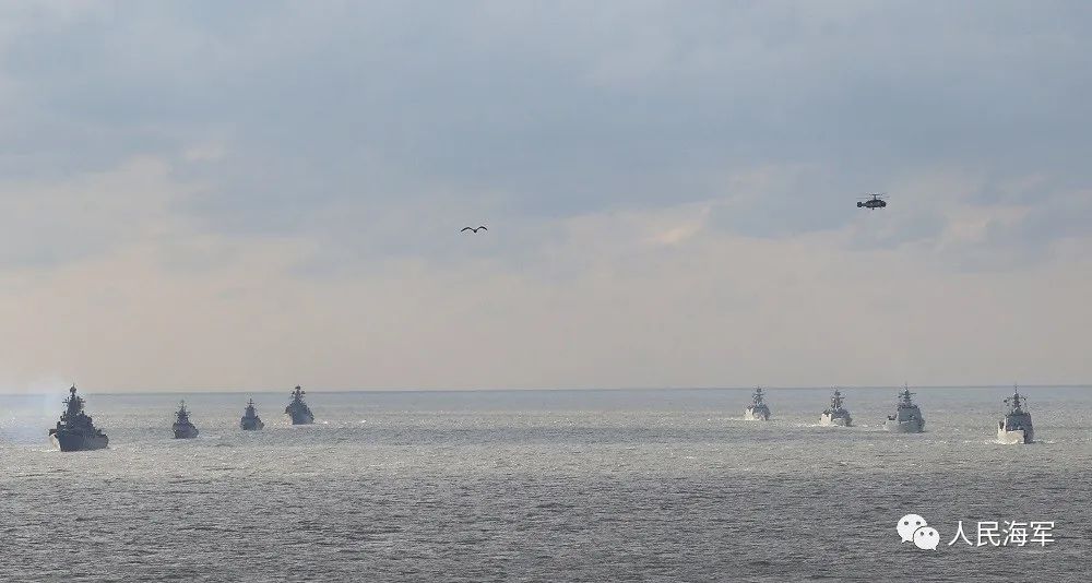 悬挂中俄两国国旗的参演舰艇编队,组成右双纵队,保持等间距、横距,各舰武器系统保持礼仪仰角,舰载直升机位起降平台系留,中方舰艇悬挂“UW1”欢送旗组,双方官兵位内舷分区列队。