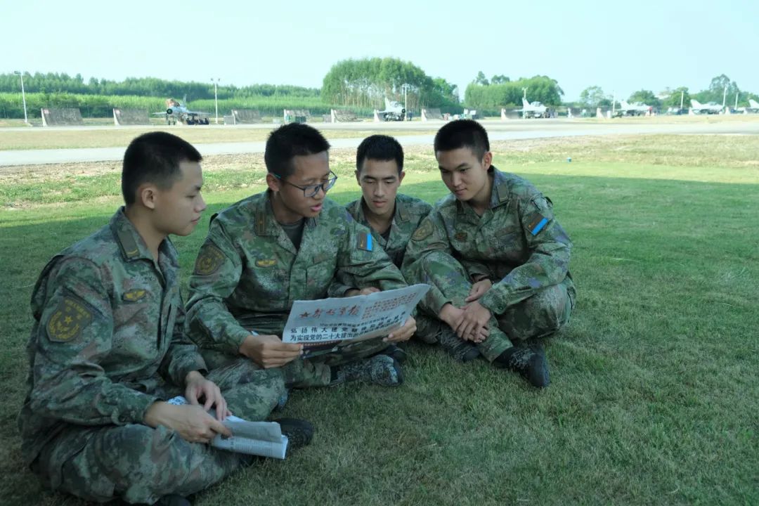 在跨昼夜飞行训练现场,汽车连官兵们利用战鹰升空训练的间隙时间,在休息室图书角前一起学习讨论党的二十大报告热点话题。入伍13年、安全行驶18万公里的红旗车驾驶员付俊超分享了他在入伍以后,尤其是党的十八大以后感受到的各种变化。