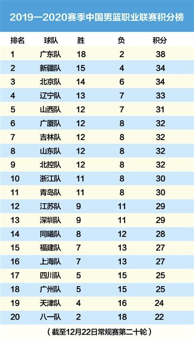 12月22日,2019—2020赛季中国男篮职业联赛(CBA)常规赛战罢第二十轮,广东队凭借18胜2负的战绩占据积分榜榜首位置,新疆队、北京队、辽宁队紧随其后。目前进入前十二名的球队中,第五名的山西队与第十一名的青岛队相差不过1个胜场,争夺十分激烈。