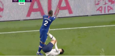 比赛中出现了几次不太和谐的镜头:先是比赛进行到第45分钟时,热刺门将加扎尼加出击失误,以一脚德甲logo似的飞踹撞到马科斯-阿隆索,最终裁判判罚点球并出示黄牌一张;不久后的一幕则更为惊人,孙兴慜在与吕迪格碰撞倒地后,一向以温柔谦逊示人的他竟用一个明显的蹬踏动作踢倒了吕迪格,虽然后者的反应确实有点夸张的成分,但孙兴慜的动作实属不应该。