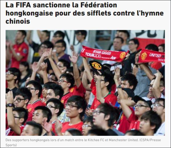 据法国《队报(lequipe)》24日报道,港足上月在主场出战世界杯外围赛,先后在对巴林及柬埔寨,期间有香港球迷在赛前唱国歌环节时嘘国歌,并举起针对警方的标语、高叫政治性口号。