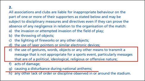 国际足联一向禁止球迷在比赛期间展示与比赛无关的政治标语,以维护球赛的公平举行。
