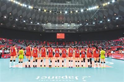 女排世界杯上,中国女排球员在赛前唱国歌。