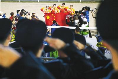 武汉军运会上,中国女子现代五项选手向看台上的解放军拉拉队敬礼致意。