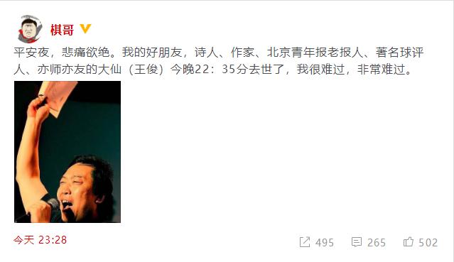 12月24日晚,据体育媒体人棋哥透露,著名球评人大仙(王俊)去世,享年60岁。随后,多位博主也发文证实了此消息。