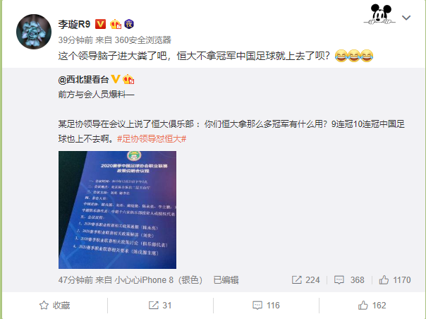 12月25日,足协在北京召开中超投资人大会,公布了新赛季外援、限薪等重要政策。据媒体人“西北望看台”透露,会上一足协领导谈到了广州恒大:“你们恒大拿那么多冠军有什么用?9连冠10连冠中国足球也上不去啊。”足协领导这番话引起了很多球迷和媒体热议,大家都觉得以后恒大在中超的日子不好过了。