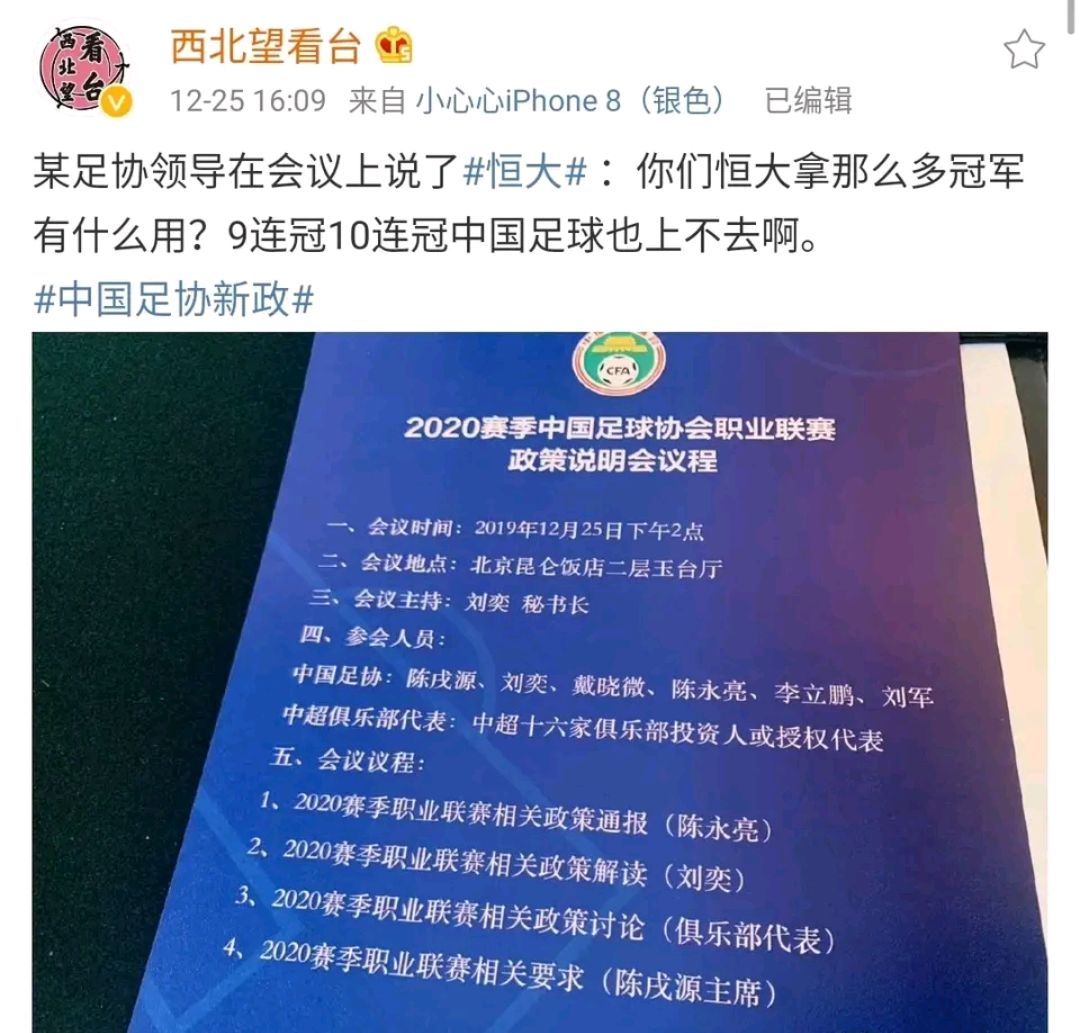 千呼万唤始出来的中超新政终于落地了,在北京昆仑饭店召开的新政宣贯会上,媒体似乎在会后对新政的内容并不怎么感兴趣,反倒是对会议使用的PPT出现明显错误非常感兴趣。而据前方记者的爆炸,足协的某位领导在发言中批了恒大,说恒大拿那么多冠军有什么用,9连冠10连冠中国足球也上不去。此消息一出,网络上出现了集体对这位领导的炮轰。