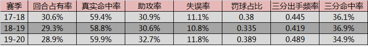 何况利拉德并没有拉稀,整体上看,不管是回合占有率、真实命中率、助攻率、失误率、侵略性还是投射表现,利拉德都维持了与过去两个赛季至少相等的战力,以下是利拉德近三个赛季进阶数据的对比: