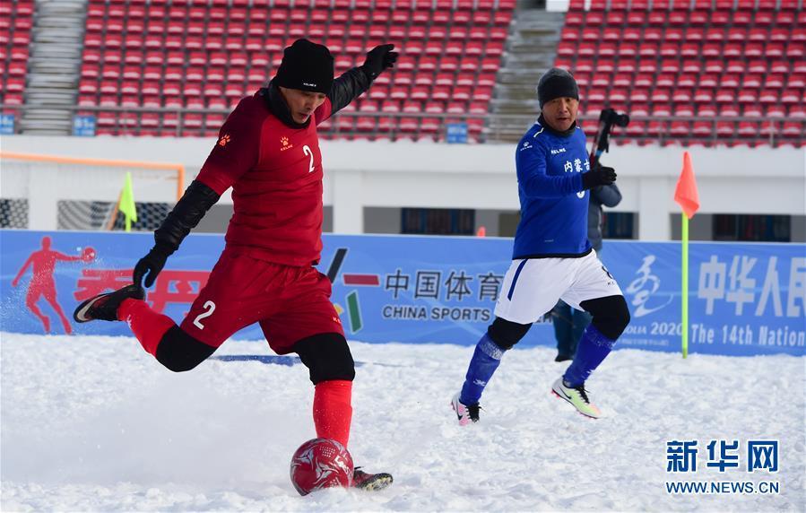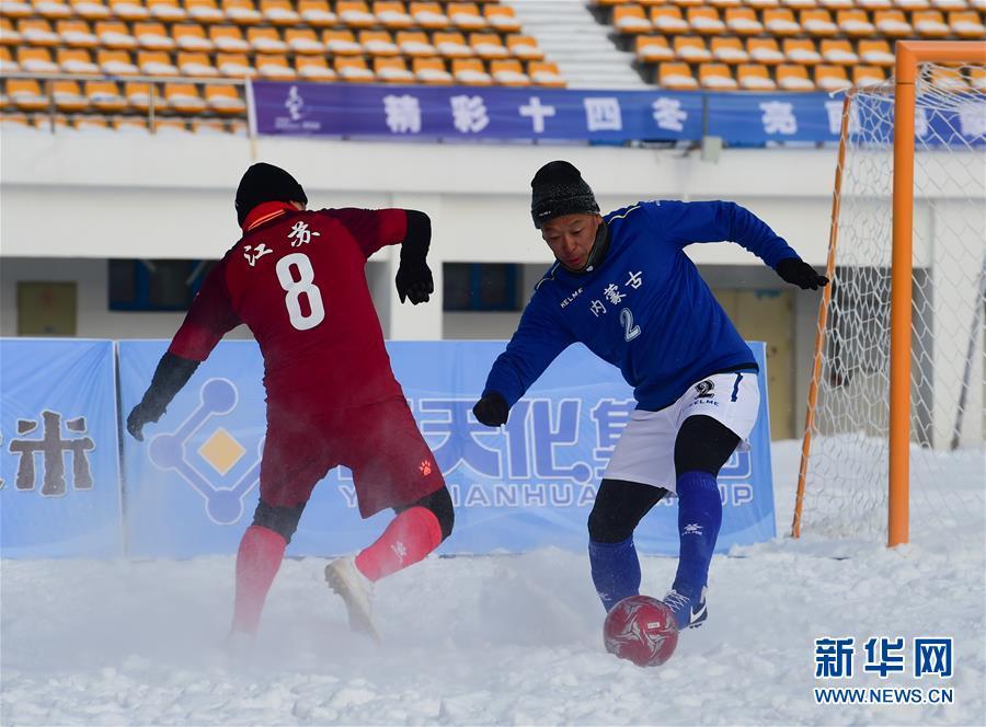 12月23日,江苏队球员耿涛(右)在比赛中进攻。 当日,在内蒙古呼伦贝尔市体育场进行的第十四届全国冬季运动会群众比赛雪地足球项目男子甲组比赛中,内蒙古队以5比2战胜江苏队。 新华社发(李志鹏摄)