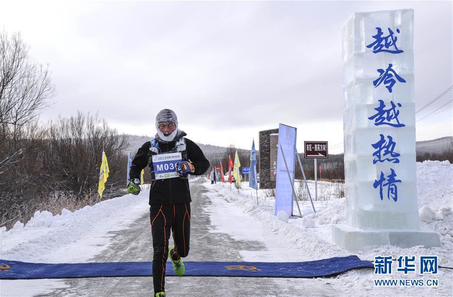 12月25日,一名参赛选手冲过终点。 当日,2019中国冷极马拉松在内蒙古自治区根河市开跑。本次赛事设男、女半程马拉松和男、女健康跑。根河市被称为“中国冷极”,最低气温达到过零下58摄氏度。 新华社记者 徐钦 摄