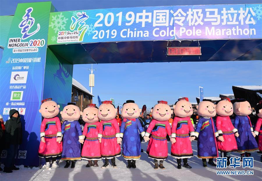 12月25日,第十四届全国冬季运动会吉祥物“安达”和“赛努”在比赛前助阵。 当日,2019中国冷极马拉松在内蒙古自治区根河市开跑。本次赛事设男、女半程马拉松和男、女健康跑。根河市被称为“中国冷极”,最低气温达到过零下58摄氏度。 新华社记者 徐钦 摄