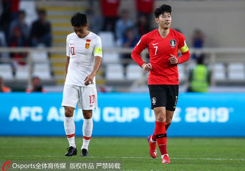 | 1月16日,2019年阿联酋亚洲杯小组赛C组:中国0:2负韩国,韩国队长孙兴慜(右)自信微笑、中国队长郑智低头失落 |