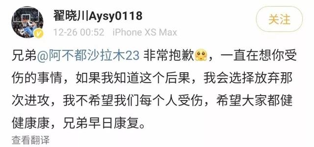 伤情发生的第一时间虽然没有确诊,但有经验的球员都能大概清楚受伤的情况,阿不都的好友方硕、曾令旭、周琦和孟铎都在球队官宣伤情之前就纷纷送上祝福。在这个过程中,翟晓川更是非常内疚,他是阿不都在国家队的队友,私交非常不错。