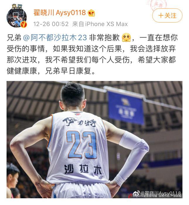 在刚开场的一次进攻中,翟晓川与阿不都沙拉木发生碰撞,导致后者严重受伤,被担架抬离球场。今天凌晨,翟晓川发文向阿不都沙拉木致歉:“如果我知道这个后果,我会选择放弃那次进攻。”(完)