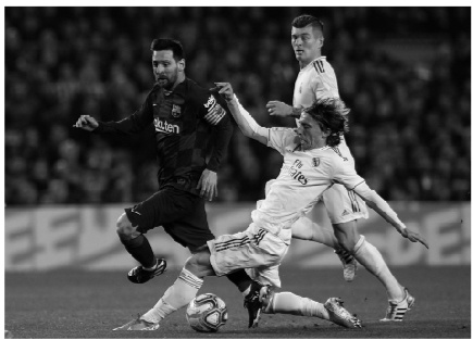 12月18日,巴塞罗那队球员梅西(左)与皇家马德里队球员莫德里奇拼抢。新华社发
