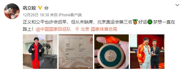 当晚巩立姣在个人微博上表示:“正义和公平也许会迟到,但从未缺席,北京奥运会第三名,好运、梦想一直在路上!”