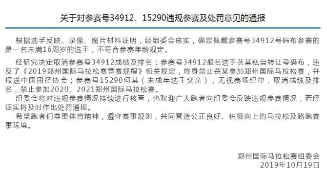 11月的上海马拉松,一位女子在比赛中途骑车,当时没有佩戴号码布,冲线的时候却带着男子全程的马拉松号码布。对此,上马开出最严罚单:“转让者”取消成绩并且2年禁止参赛上马;替跑者和其“共犯”朋友,终生禁止所有上马系列赛事,并报送中国田径协会追加处罚;