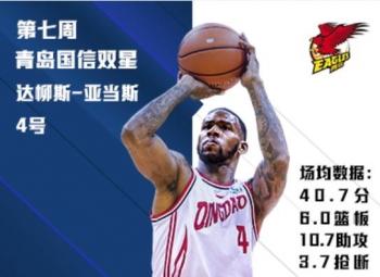 中新网12月27日电 27日,CBA公司公布了第7周最佳球员,广东队的易建联和青岛队的达柳斯-亚当斯分别当选本土球员周最佳和外籍球员周最佳。