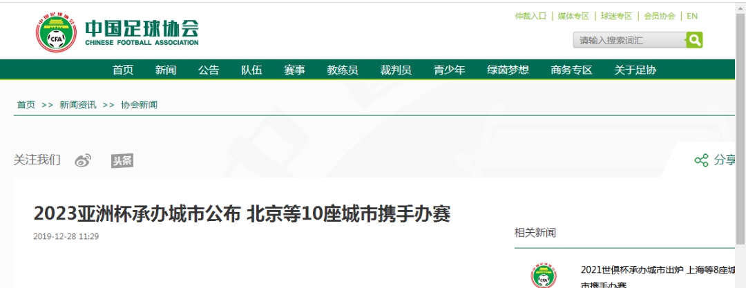 第18届男足亚洲杯将于2023年6月至7月在中国举办