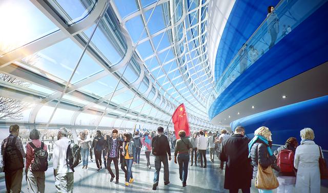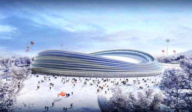 这种创新型“冰丝带”状曲面玻璃幕墙,其设计灵感来自冰雪运动与速度的结合,盘旋的“冰丝带”象征着速度滑冰运动员高速滑进时冰刀留下的轨迹,同时22条“冰丝带”又象征着在2022年举办北京冬奥会。