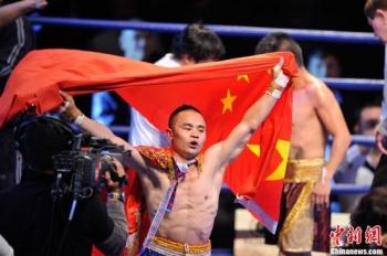 资料图:WBC迷你轻量级世界拳王金腰带争霸赛在昆明举行,矿工出身的云南籍职业拳手熊朝忠击败墨西哥拳王哈维尔·马丁内斯,成为中国首位世界拳王。图为比赛结束后熊朝忠身披国旗。中新社发 刘冉阳 摄