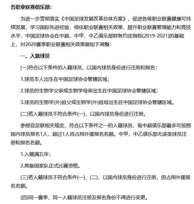中国足协关于归化球员部分的新政。图片来源:中国足协官网截图。