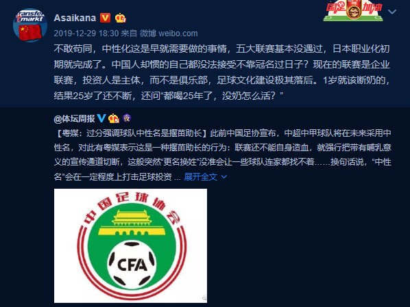 但随着改革推进,关于国内球队要不要选择中性名称的讨论随之展开。