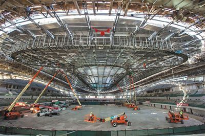 此前施工时,几百个正方体大水桶自屋顶垂吊在速滑馆场地中央,通过悬挂配重的方法模拟屋面的重量,让索网固定,随着屋面的安装再慢慢撤除配重。记者看到,随着屋面单元板全部安装完成,场地内模拟配重的水桶目前也已经全部撤除。