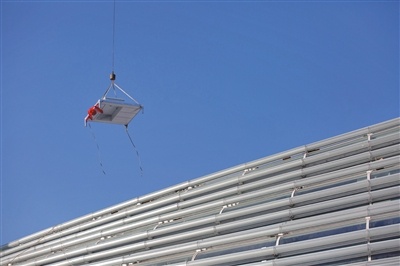 此前,施工方北京城建集团施工总承包单位相关负责人向记者解释,由于索网屋面的空间形态非常复杂,张拉以后每一个“方格”空间形态都不一样,因此填充的每一块单元体尺寸也不同,需要通过实测得到数据后再进行加工定制。此外,屋面还安装有600块左右复杂的异形单元块,可方便收集和排放雨水。