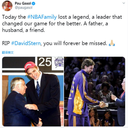 保罗-加索尔:“今天NBA大家庭失去了一位将我们的比赛变得更好的传奇,领导。一位父亲、丈夫和朋友。RIP,大卫-斯特恩,你将永远被怀念。”