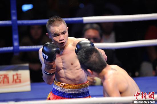 WBC迷你轻量级世界拳王金腰带争霸赛在昆明举行,矿工出身的职业拳手熊朝忠击败墨西哥拳王哈维尔⋅马丁内斯,成为中国首位世界拳王。图为熊朝忠(左)在比赛中。中新社发 刘冉阳 摄