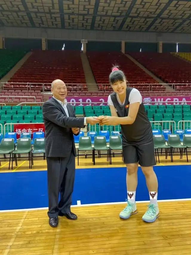 罗友财(左)奖励李月汝中圈投中篮 俱乐部供图