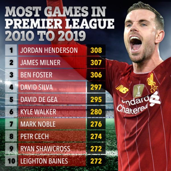 效力于利物浦的球员亨德森以308次出场名列榜首,仅比队友米尔纳领先一次。沃特福德队门将本·福斯特名列第三,他于2018年加盟该队。