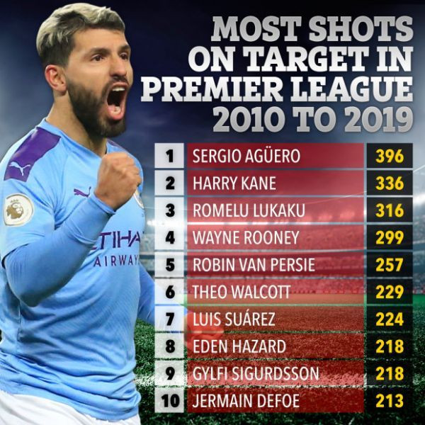 曼城球员阿奎罗是过去10年里英超最具杀伤力的前锋,他共攻入174粒进球,超过了本世纪头十年的最高纪录(亨利,169粒)和上世纪90年代的最高纪录(席勒,1992年8月加盟英超以来的167粒)。