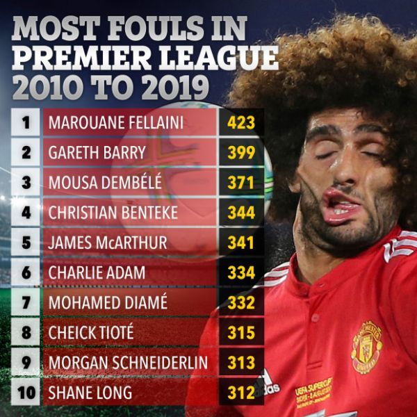 加雷斯·巴里以64张黄牌、3张红牌总共67张的纪录高居榜首。