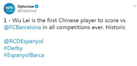 这粒进球帮助西班牙人在主场2-2绝平巴萨,拿到了球队新年第一分。同时,武磊个人也成为了历史上首位攻破巴萨球门的中国球员!