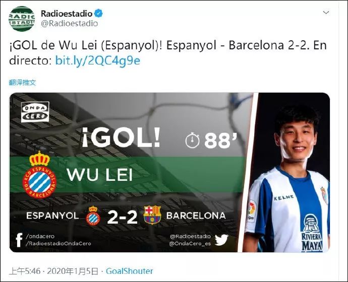 1月5日凌晨,2019/2020赛季西甲第19轮,西班牙人主场迎战巴塞罗那,武磊73分钟被换上后,88分钟打入关键一球。这粒进球帮助西班牙人在主场2-2绝平巴萨,而武磊个人也成为了历史上首位攻破巴萨球门的中国球员!