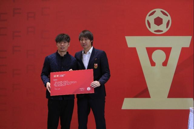 1月5日,李铁(右)在见面会上向球员张稀哲颁发国足邀请函。 新华社发