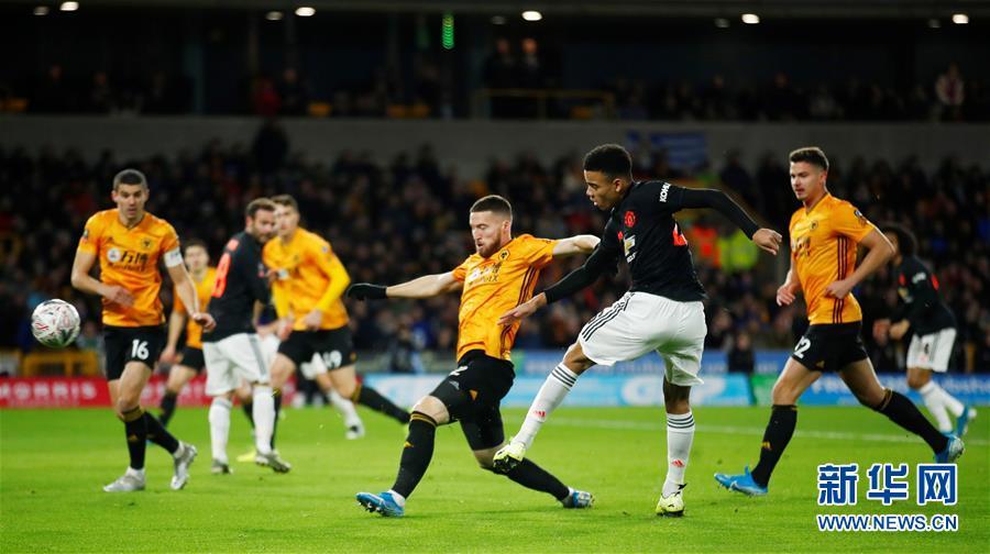 1月4日,曼联队球员格林伍德(右二)在比赛中射门。 当日,在2019-2020赛季英格兰足总杯第三轮比赛中,曼联队客场以0比0战平狼队。 新华社/路透