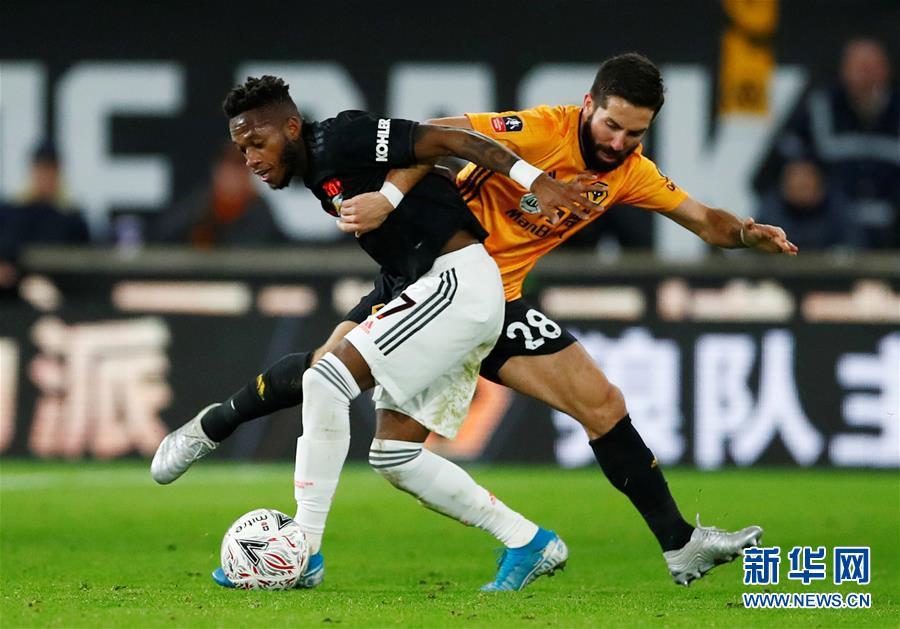 1月4日,曼联队球员弗雷德(左)与狼队球员穆蒂尼奥在比赛中拼抢。 当日,在2019-2020赛季英格兰足总杯第三轮比赛中,曼联队客场以0比0战平狼队。 新华社/路透