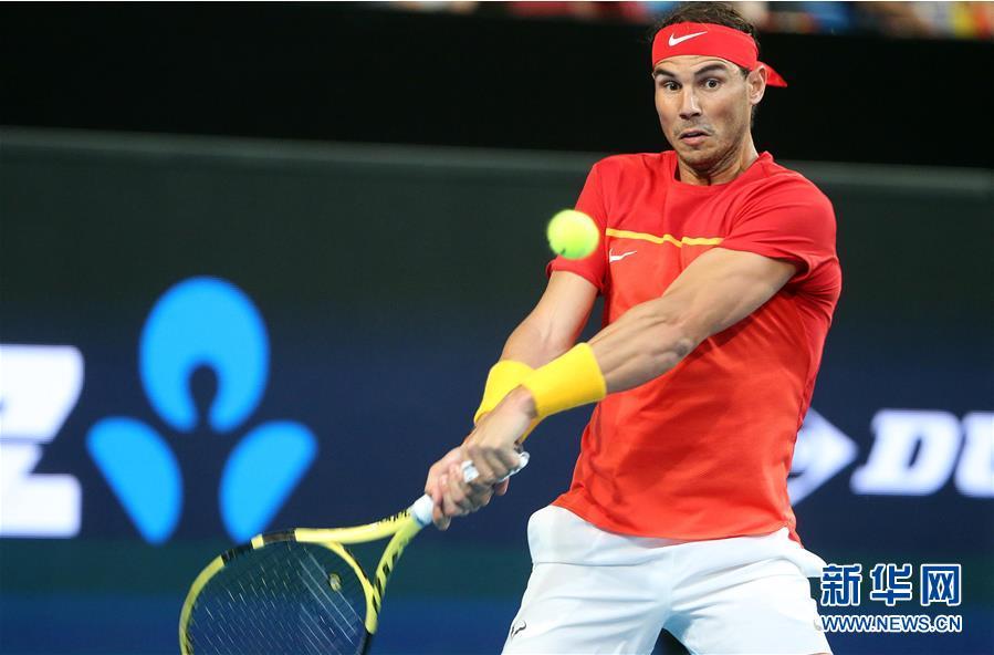 1月6日,纳达尔在比赛中回球。 当日,在澳大利亚珀斯进行的ATP杯网球赛B组比赛中,西班牙队选手纳达尔以2比0战胜乌拉圭队选手奎瓦斯。 新华社发(周丹摄)