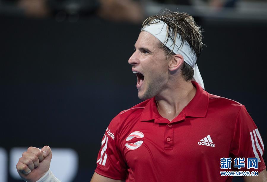 1月6日,蒂姆在比赛中庆祝得分。 当日,在澳大利亚悉尼进行的ATP杯网球赛E组比赛中,奥地利队选手蒂姆以2比0战胜阿根廷队选手施瓦茨曼。 新华社发(胡泾辰摄)