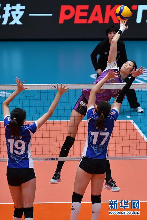 1月7日,天津渤海银行队球员朱婷(右一)在比赛中扣球。 当日,在2019-2020赛季中国女排超级联赛决赛首回合比赛中,天津渤海银行队以3比0战胜上海光明优倍队。 新华社记者李然摄
