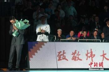 资料图:2019年11月2日,上海男篮在CBA新赛季首场比赛开赛前,为球队传奇后卫刘炜举行了退役仪式,并将他的8号球衣永久封存。中国篮协主席姚明也专程赶来,并为刘炜颁发了“中国篮球之队磐石奖”。图为退役仪式现场。中新社记者 张亨伟 摄