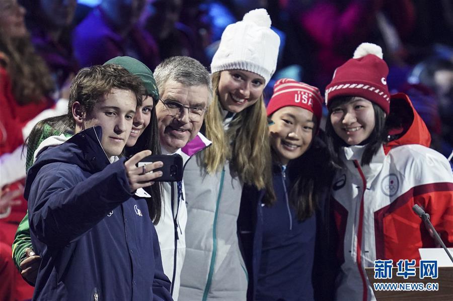 1月9日,国际奥委会主席巴赫(右四)在开幕式上与运动员自拍。 当日,第三届冬季青年奥林匹克运动会开幕式在瑞士洛桑沃州体育馆举行。 新华社记者张晨霖摄