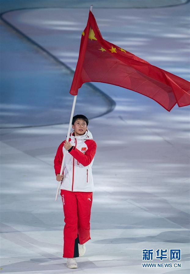 1月9日,中国代表团旗手、冬季两项运动员丁雨欢在开幕式上执国旗入场。 当日,第三届冬季青年奥林匹克运动会开幕式在瑞士洛桑沃州体育馆举行。 新华社发(国际奥委会供图)