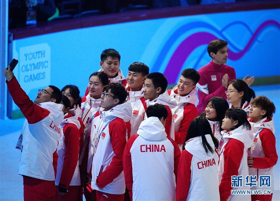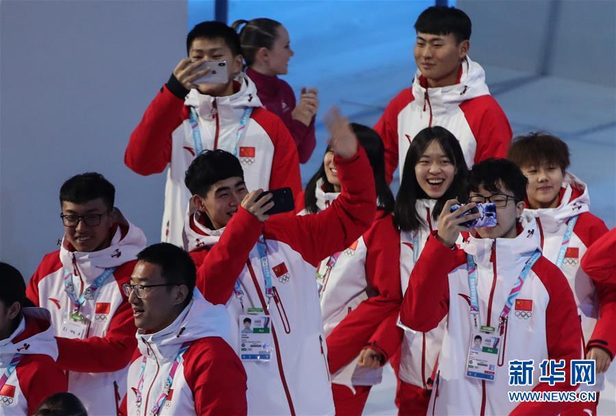 1月9日,中国代表团成员在开幕式上自拍。 当日,第三届冬季青年奥林匹克运动会开幕式在瑞士洛桑沃州体育馆举行。 新华社记者张晨霖摄