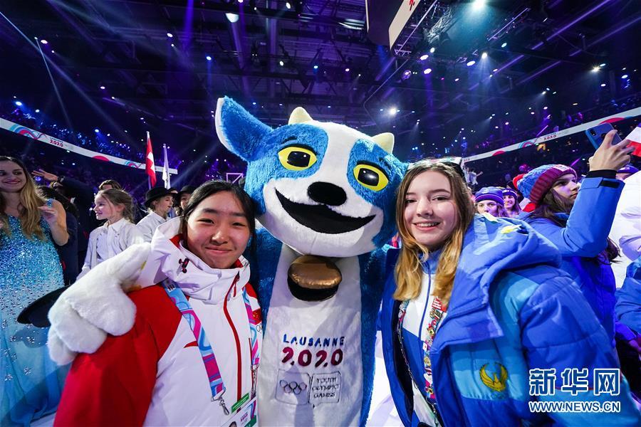 1月9日,运动员与赛会吉祥物“约德里”在开幕式上合影。 当日,第三届冬季青年奥林匹克运动会开幕式在瑞士洛桑沃州体育馆举行。 新华社记者逯阳摄